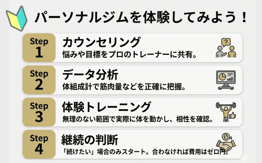 - 正しいフォーム・継続・安全性を確保するなら、マンツーマンのパーソナルジムが断然おすすめ