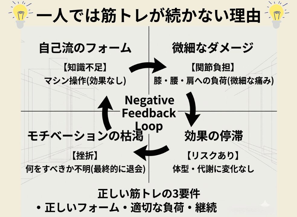 フォームが正しいか判断しにくい、メニューの組み方がわからない、ケガのリスクがある、モチベーションが続きにくい、といったデメリットがあります。