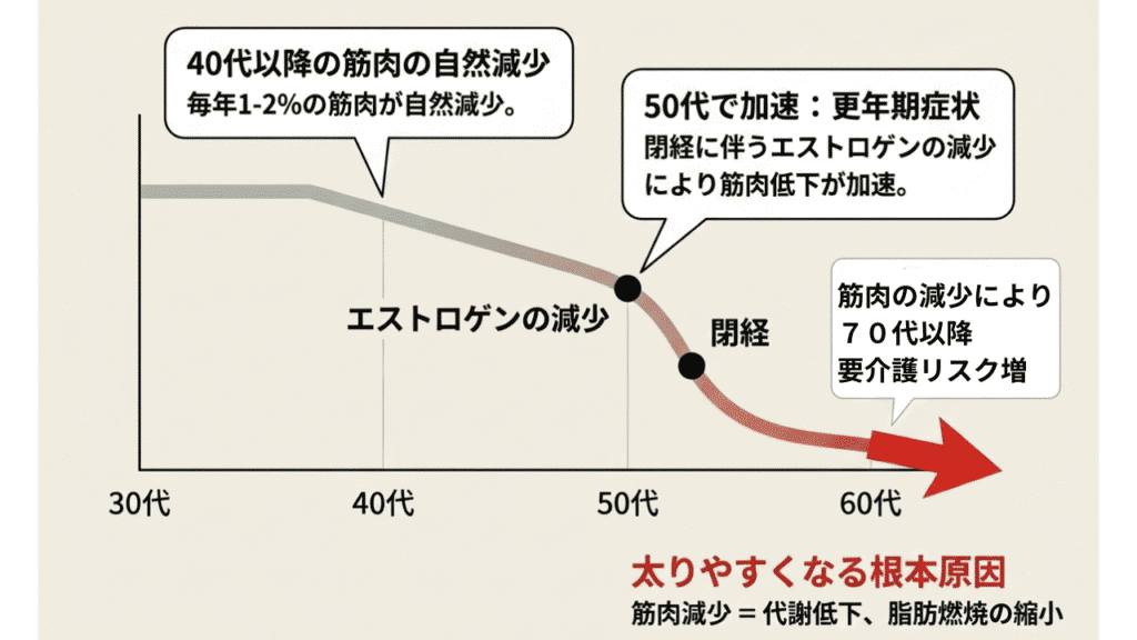 特に女性は閉経後にエストロゲンが減少することで筋肉が落ちやすくなり、50代での筋肉量の低下は加速します。筋肉が減ると基礎代謝が落ち、同じ食事量でも太りやすくなる原因に!