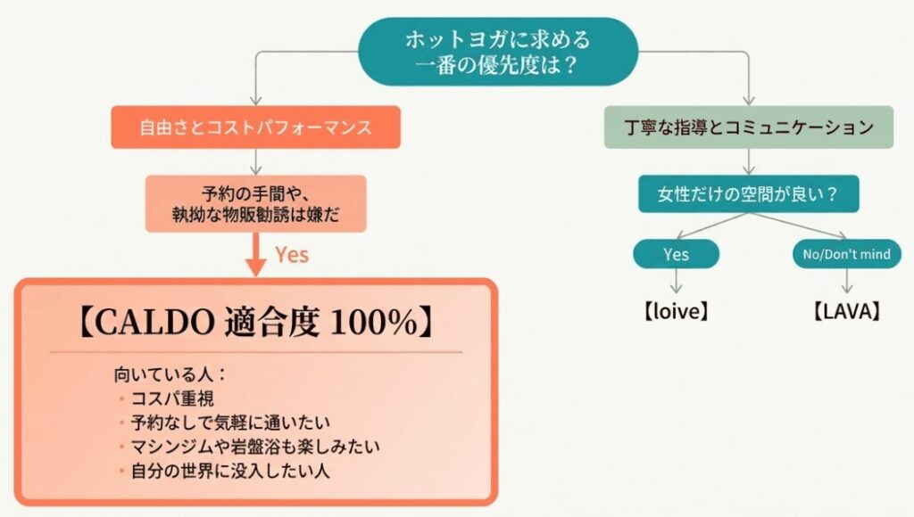 LAVAやロイブなど、ほとんどのホットヨガスタジオは予約制になっています。しかし、カルドは全店舗予約不要です。