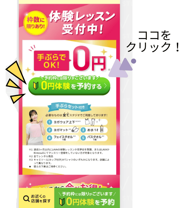 実は、LAVAのHPを見ても「ホットマシンピラティス」についてほとんど分かりません!開催してる店舗のページまでたどり着いて、はじめてホットマシンピラティスに気付く程度です。しかも、LAVAのHPで「マシンピラティス開催店舗を見る」は、常温の店舗も含めた検索しかできないので、HPからはホットマシンピラティス開催店舗だけで調べることが出来ないんです!