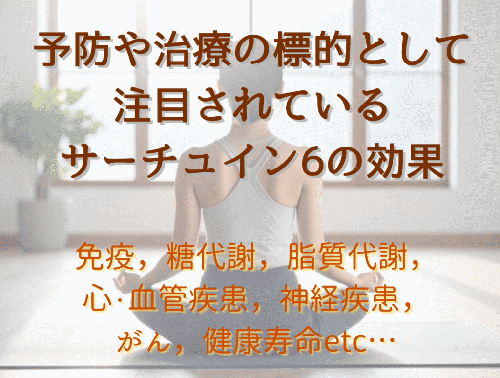 「サーチュイン6」とは、免疫,糖代謝,脂質代謝,神経疾患etcなどに重要な役割を果たしており、疾患の予防や治療の標的として注目されている長寿遺伝子です。
