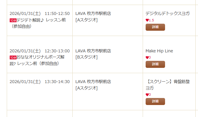 | 店舗名 | イルチブレインヨガ枚方 | ピラティス・ヨガスタジオ kiraris 2nd | チタチタ枚方 |