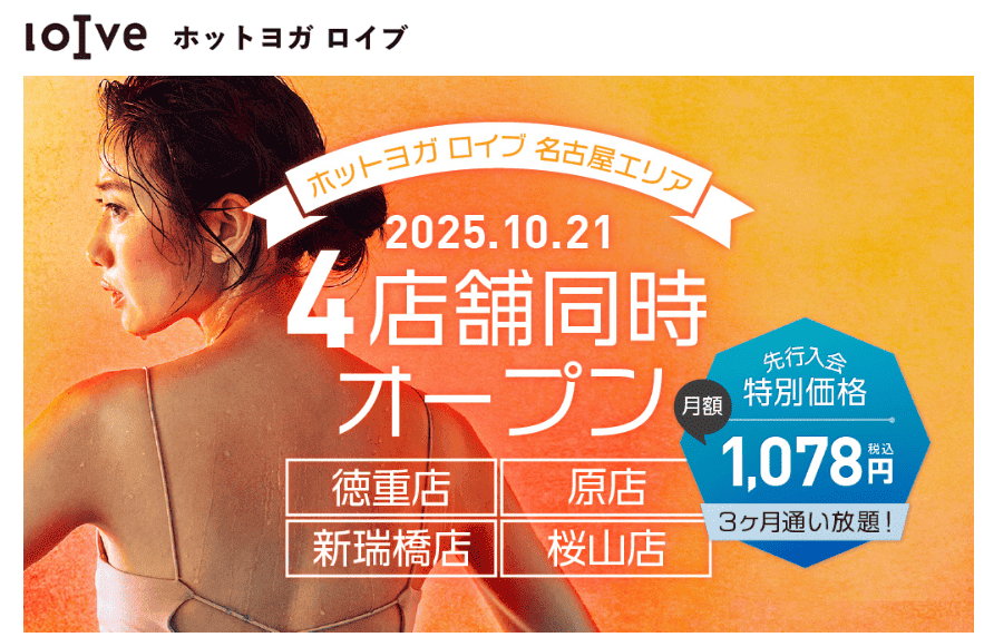ホットヨガスタジオの「loive(ロイブ)」が2025年10月21日愛知県名古屋市に4店舗同時にオープンします!
