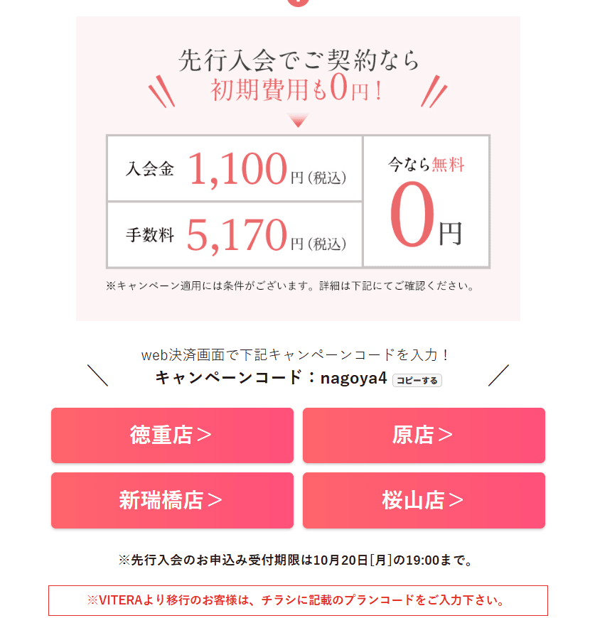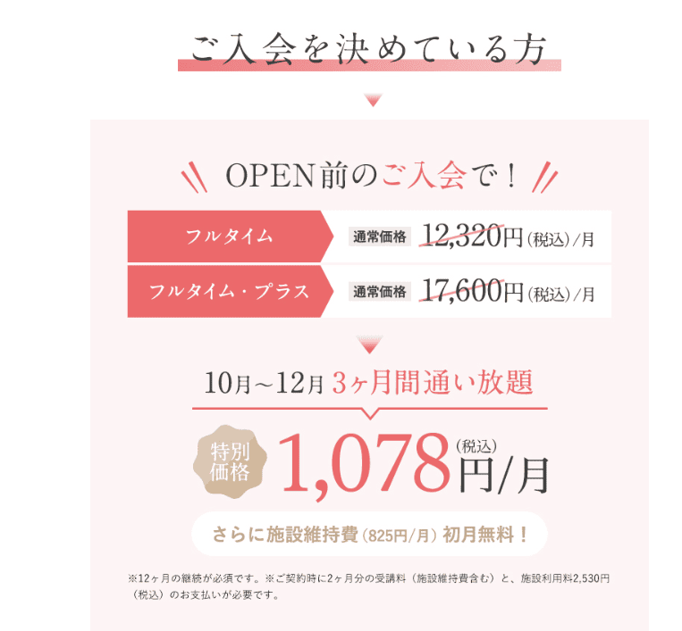 3か月間通い放題1,078円/月の特別価格に加えて、さらに先行入会で手数料も0円になります。