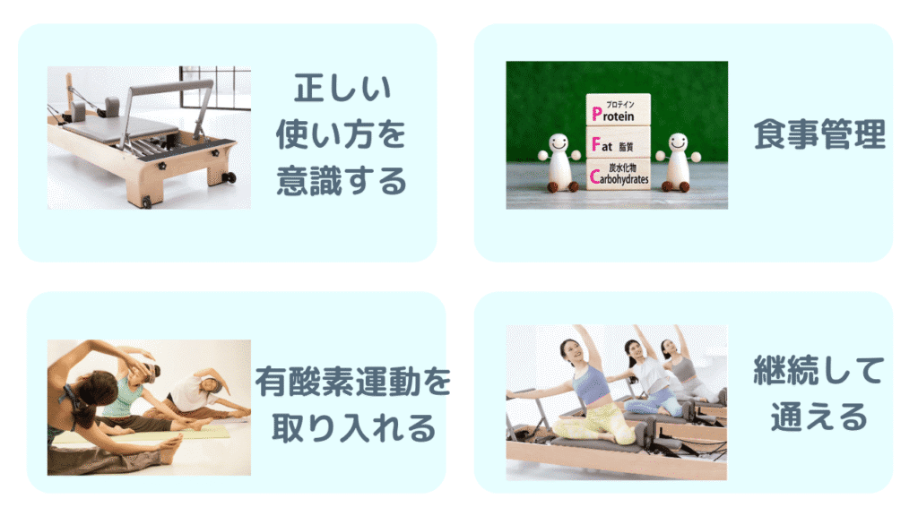 この4つのポイントを押さえることで、マシンピラティスの効果を期待することができます。