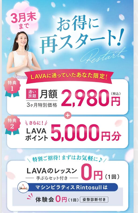 以前LAVAに通っていて、またLAVAを再開したい人は、2回目の無料体験を受けてからキャンペーンで再開するのがとってもお得なことが分かりましたね。